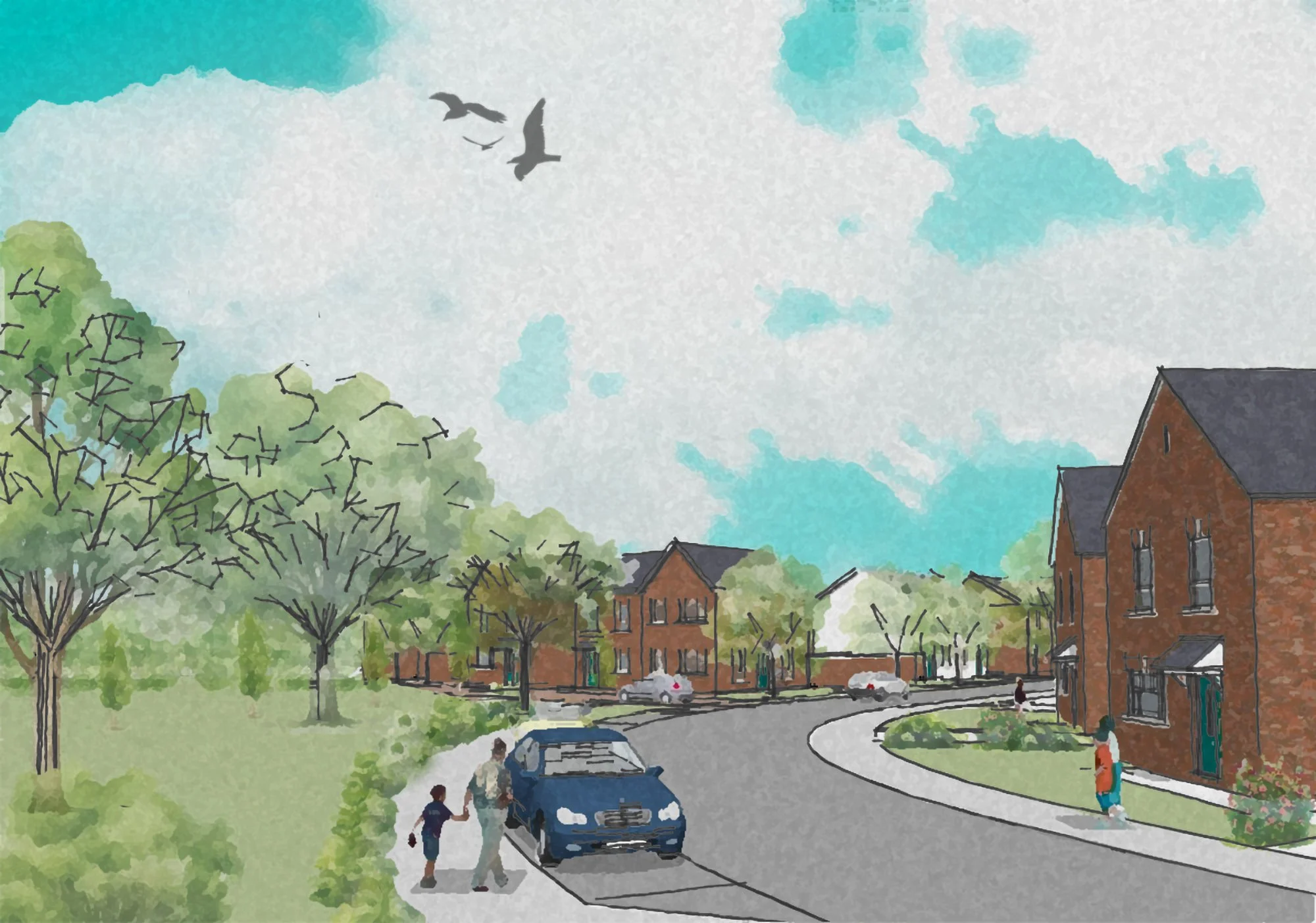 The development will be mainly 2-storey houses. Four bungalows will also be included. They will be a mix of detached, semi-detached and terraced properties. A mix of red brick and white render to match local tones will be used. Roofs will be tiled, pitch, roofs.